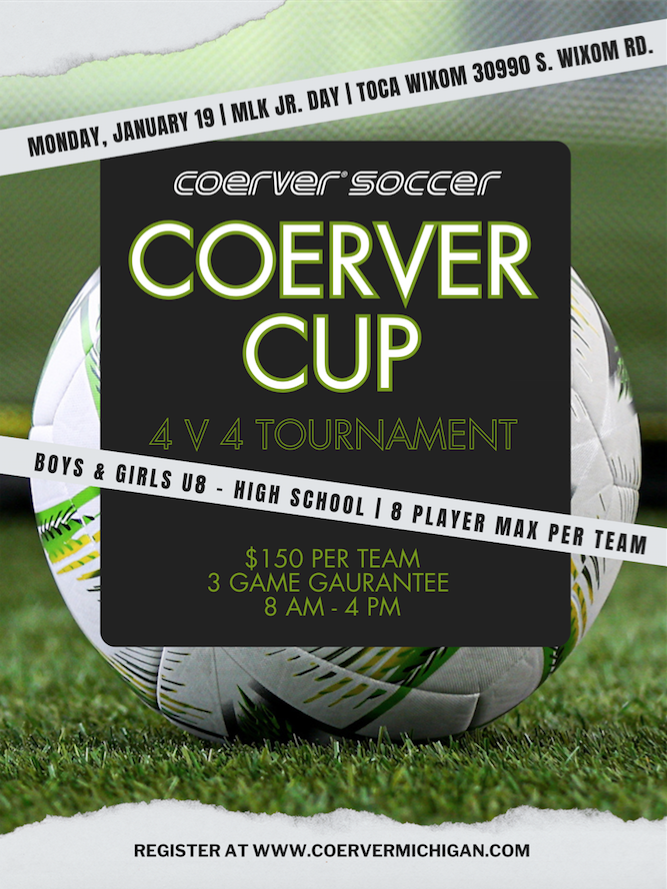 The Fifth Annual Coerver Cup 4v4 Tournament is coming up Monday, January 19th, 2026 - on MLK Jr. Day!
