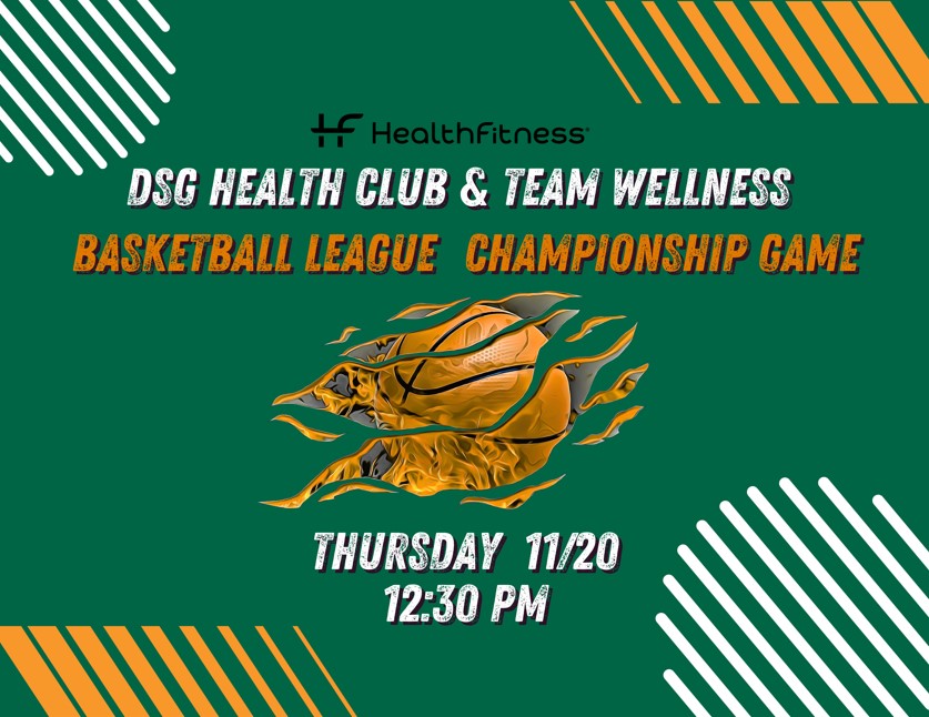 DSG Health Club and Team Wellness Basketball League Championship will take place on Thursday, 11/20 at 12:30pm on the Basketball Court. Come cheer on your favorite team. Event will be open to all!