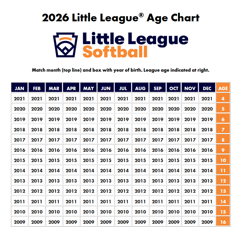 Please review the charts below to determine the league age of your Little Leaguer. Alternatively, you can enter your child's birth date here. After finding the league age, please review the divisions your player will be eligible to play in: Baseball or Softball