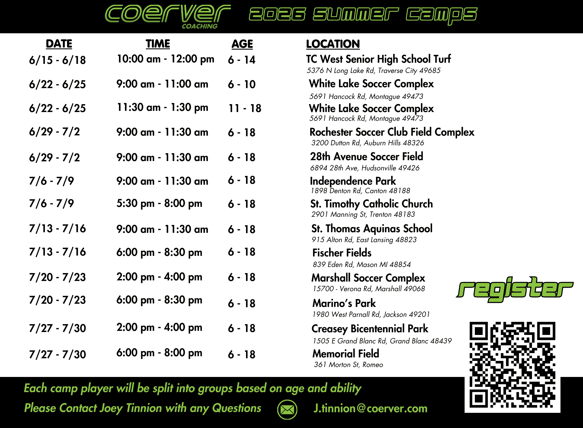Players will be split into groups based on age and ability.
