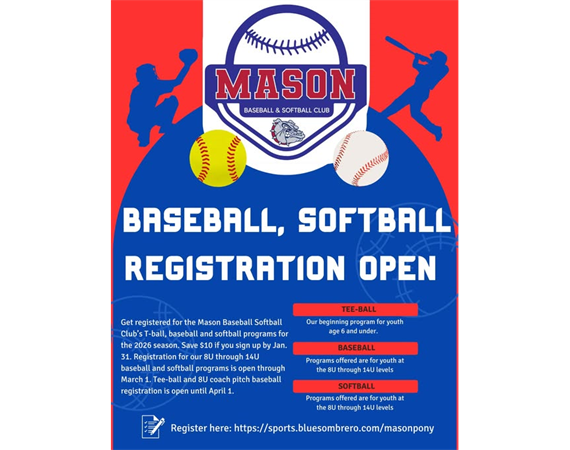 Registration is open for the Mason Baseball Softball Club's 2026 programs.